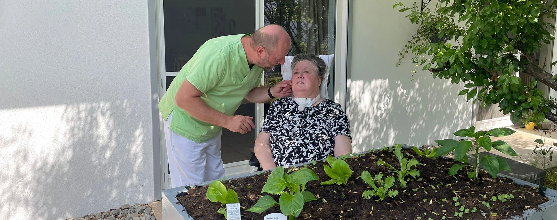 Für die Bewohnerinnen ist es mehr als nur ein Beet. Eva-Maria Gerstner etwa kann mit ihrer linken Hand in der Erde wühlen, die Finger wieder ein bisschen schmutzig machen. „Das weckt Erinnerungen an früher – und gibt ihr das Gefühl, wieder etwas tun zu können“, sagt Pflegedienstleiter Ralf Wienkemeier.